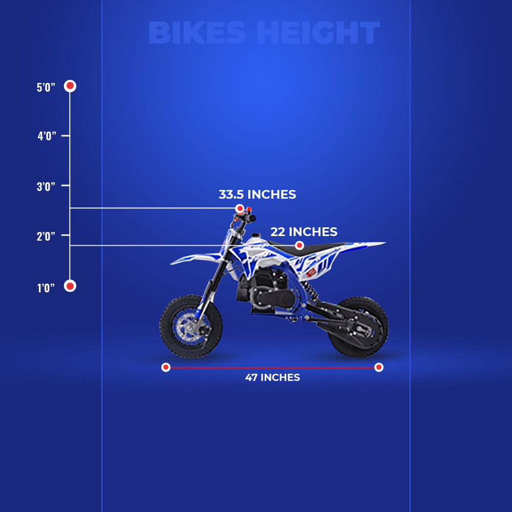 MotoTec 52cc Villain Kids Dirt Bike - The perfect kids starter dirt bike. The latest generation of 52cc mini bike engines, it's fully automatic, so just twist the throttle and go.Responsive acceleration, front telescopic forks, rear mono shock suspension, front and rear disk brakes, motocross styling and big bike attitude, makes this the perfect children’s choice.
