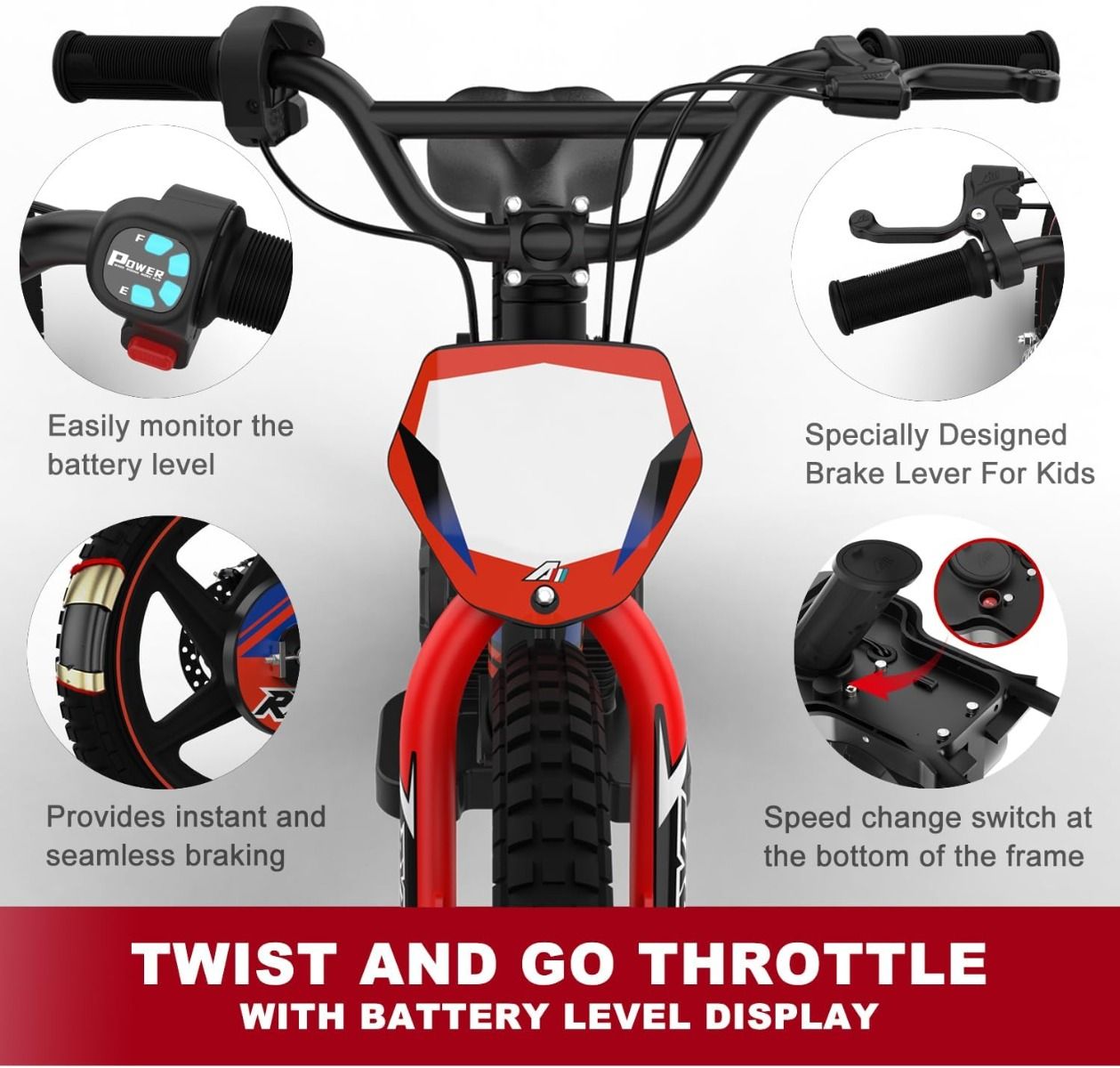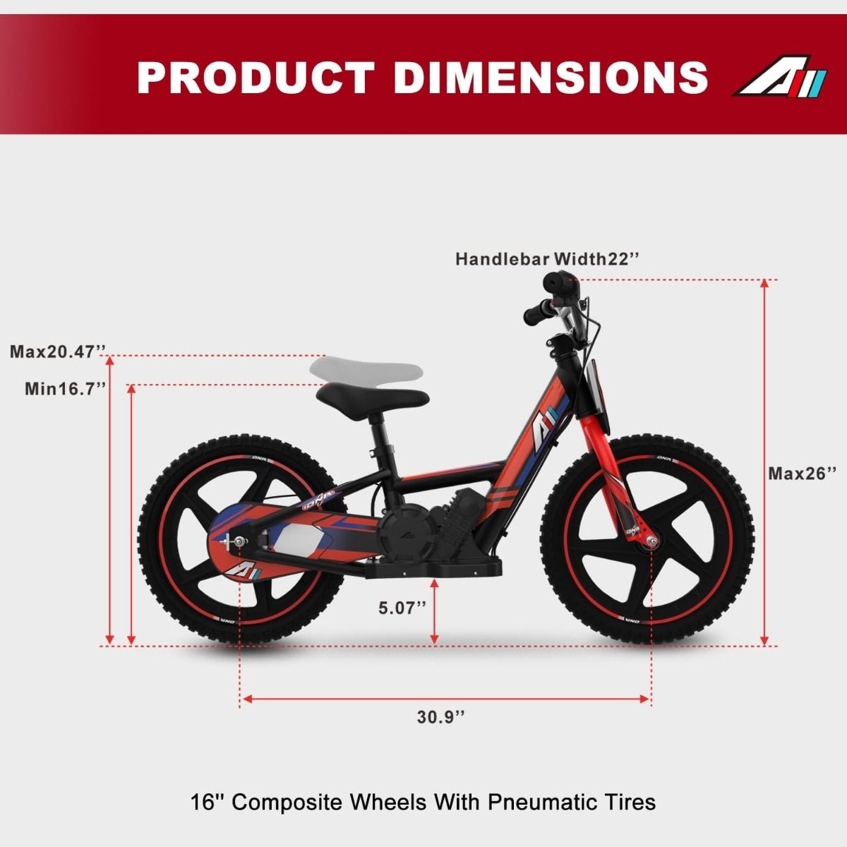 RED - 24V Electric Dirt Bike for Kids, 16" Wheel Electric Balance Bike for Ages 5-10