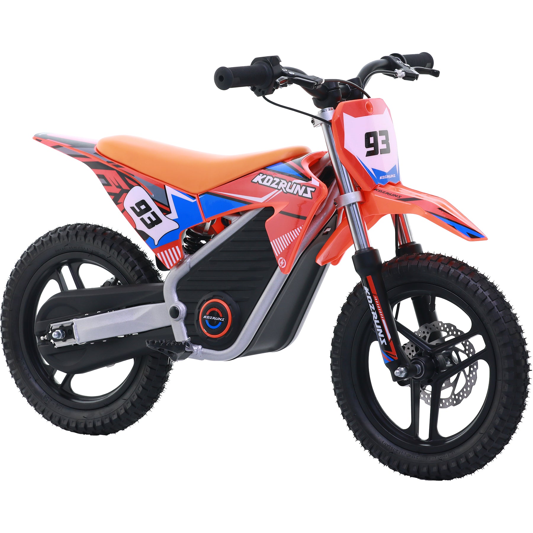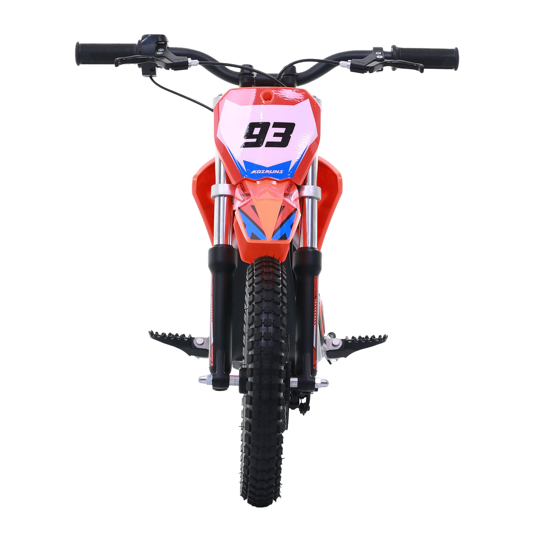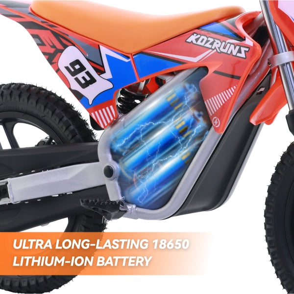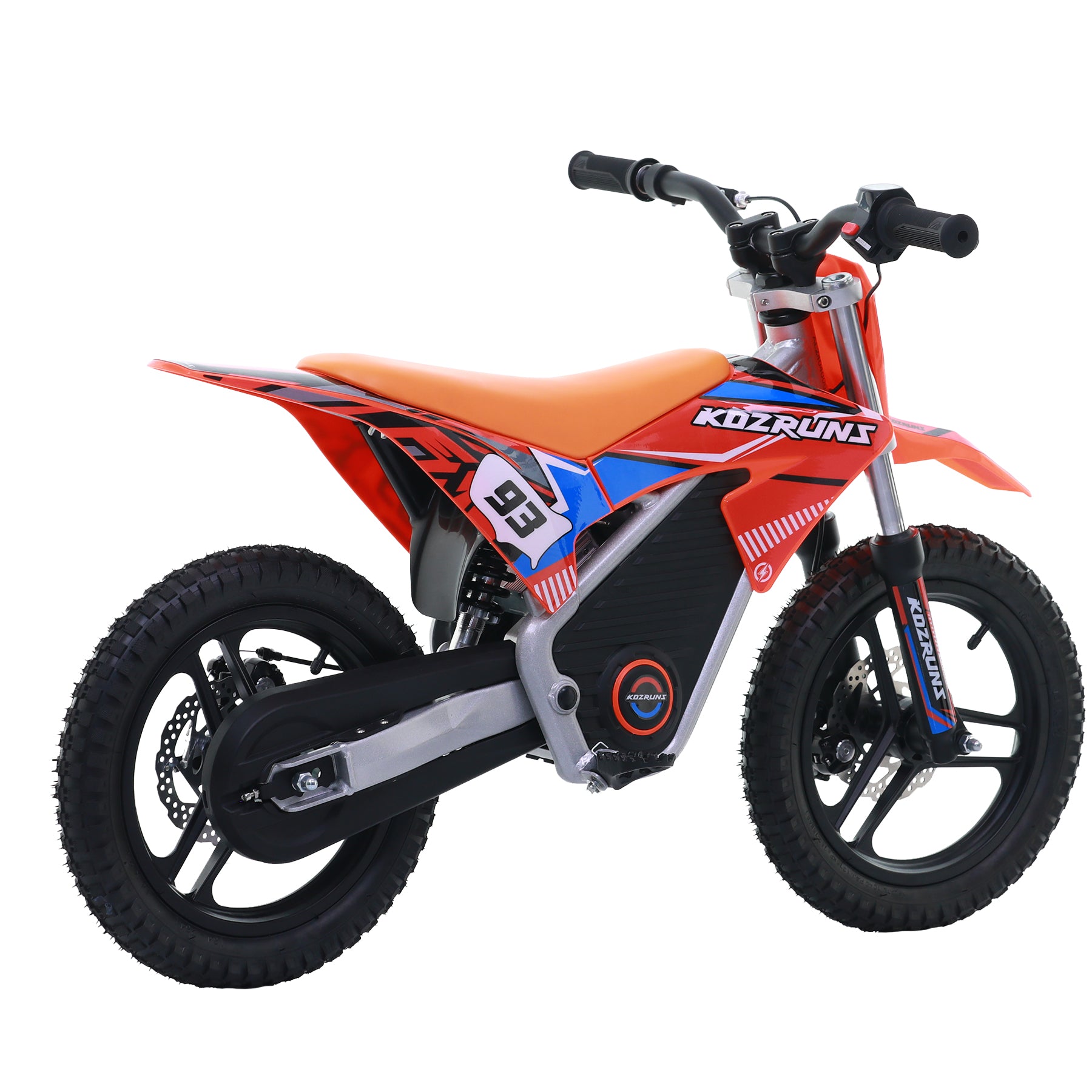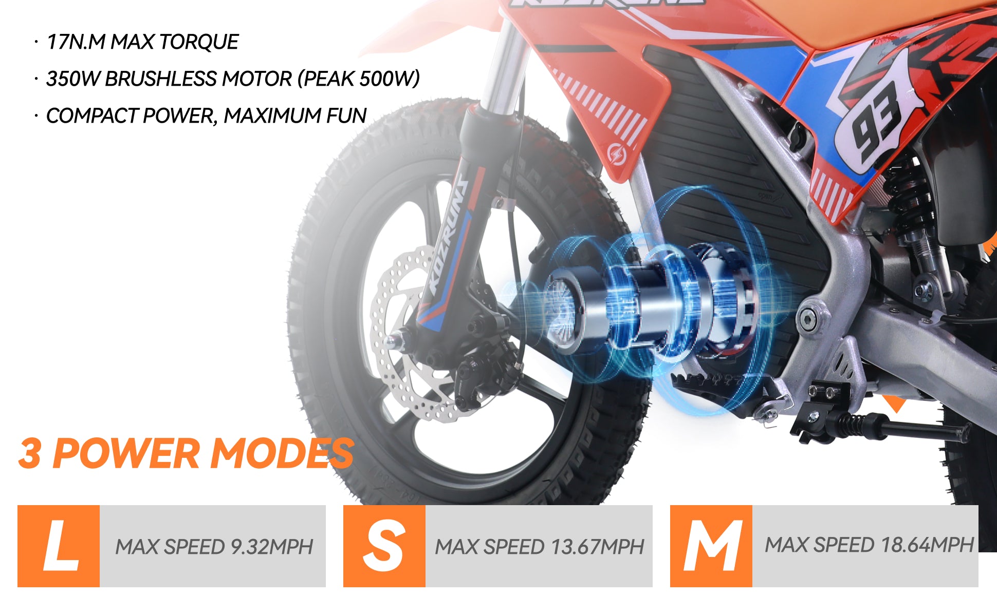 The MX-E Electric Dirt Bike equipped with a central 5800rpm high-torque brushless motor, with a maximum power of 500W, powerhouse features large 14-inch tires and a quick-swap 36V 5AH lithium battery encased in a lightweight aluminum frame. Adjustable speed settings (9.3, 13.7, and 18.6 MPH) cater to different levels of riders, making it ideal as children grow.