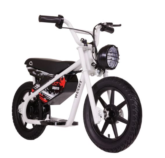 WHITE - Droyd Weeler Electric Mini Bike for Kids 6+, 200W, 6.2-10 MPH, 8 Miles Range, 14" Tire, 24V 8Ah Battery, 45 Min Run Time